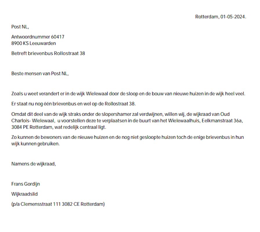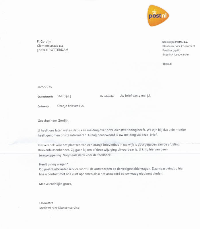 Na een brief vanuit de wijkraad heeft post.nl de lokatie van de brievenbus aangepast.