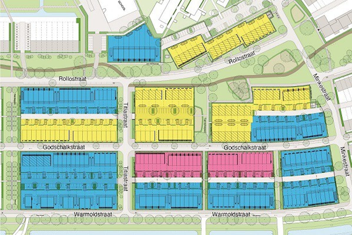 De gele arcering op de plattegrond zijn de 77 sociale huurwoningen voor de eerste terugkeerders. Blauw zijn koopwoningen, roze zijn middeldure huurwoningen van een belegger.