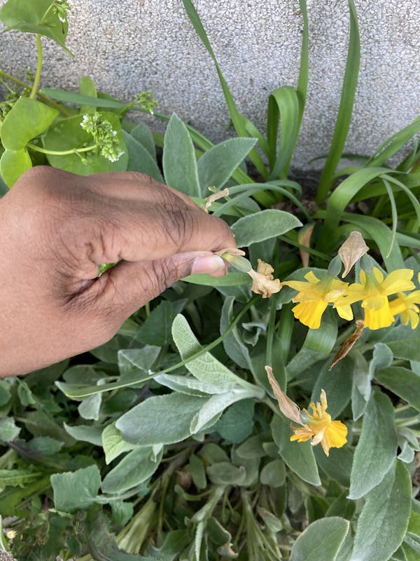 De zaaddozen zijn die kleine, bolvormige dingen bovenaan de stengel, en daar gaat al haar energie naartoe. Zonde, want we willen juist dat de bol die energie krijgt. Die moet immers volgend jaar weer aan de bak! Knip de zaaddoos dus voorzichtig weg, maar laat de blaadjes aan de plant zitten.