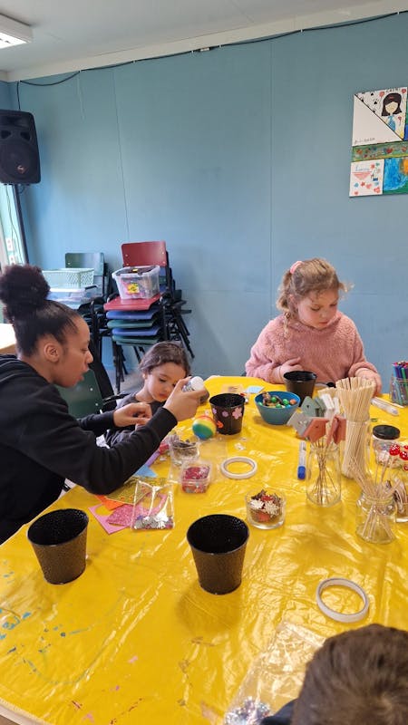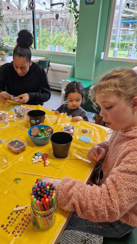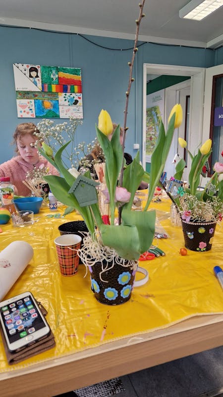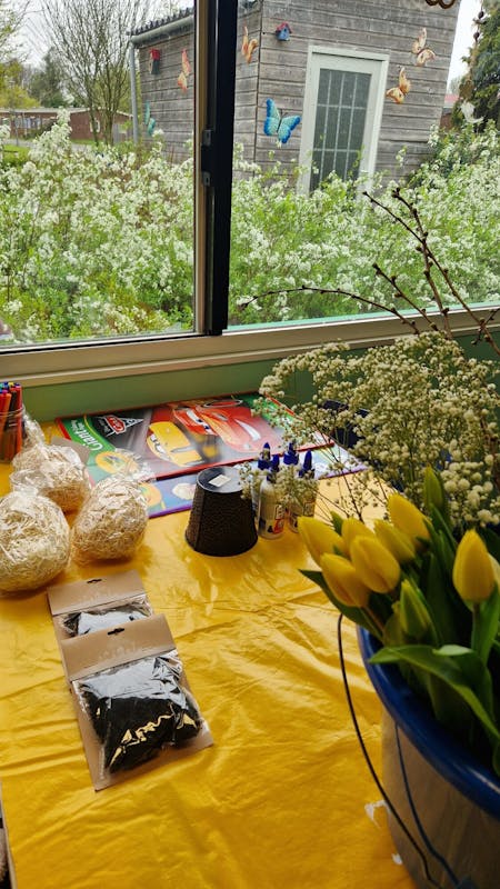 Vanmiddag kinderinstuif geweest. We hebben bloempotjes versierd en daarna met tulpen (wit en geel), roze ranonkels, gipskruid en takken bloemschikken. Wat een mooie creaties 😃.