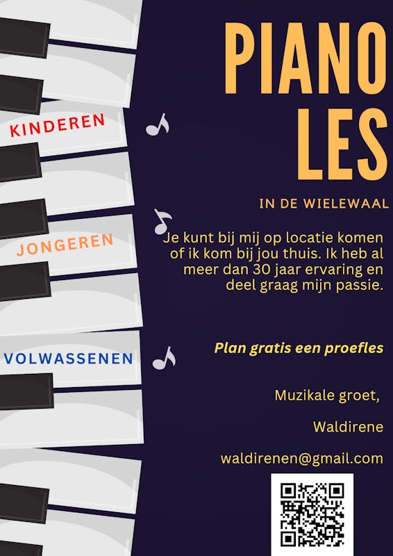 Dus heb je altijd al piano willen spelen, dat kan nu gewoon in je eigen buurt. Maak een afspraak met haar voor een proefles en je bent meteen verkocht. Ze geeft les aan kinderen, jongeren en volwassenen.