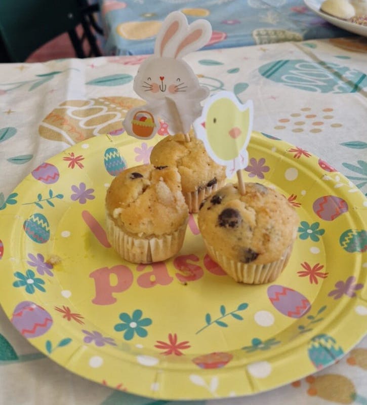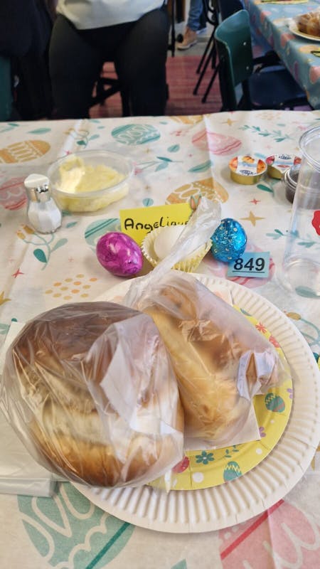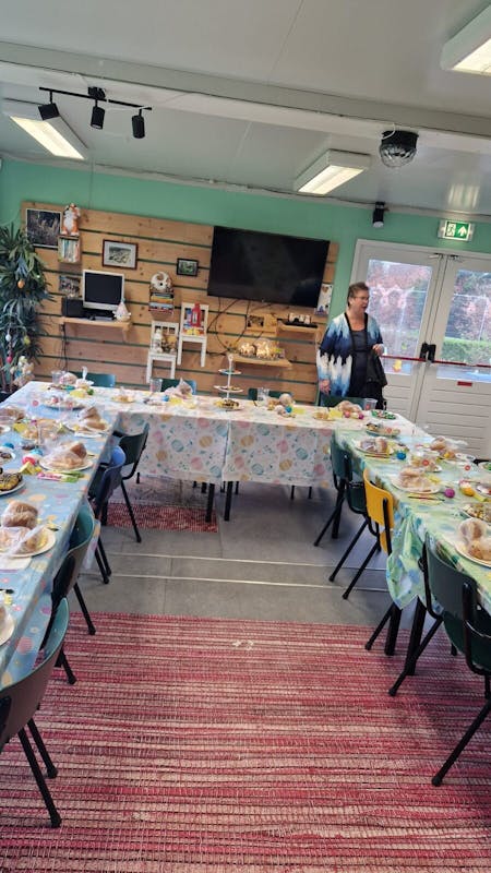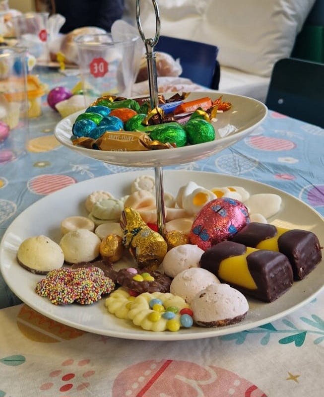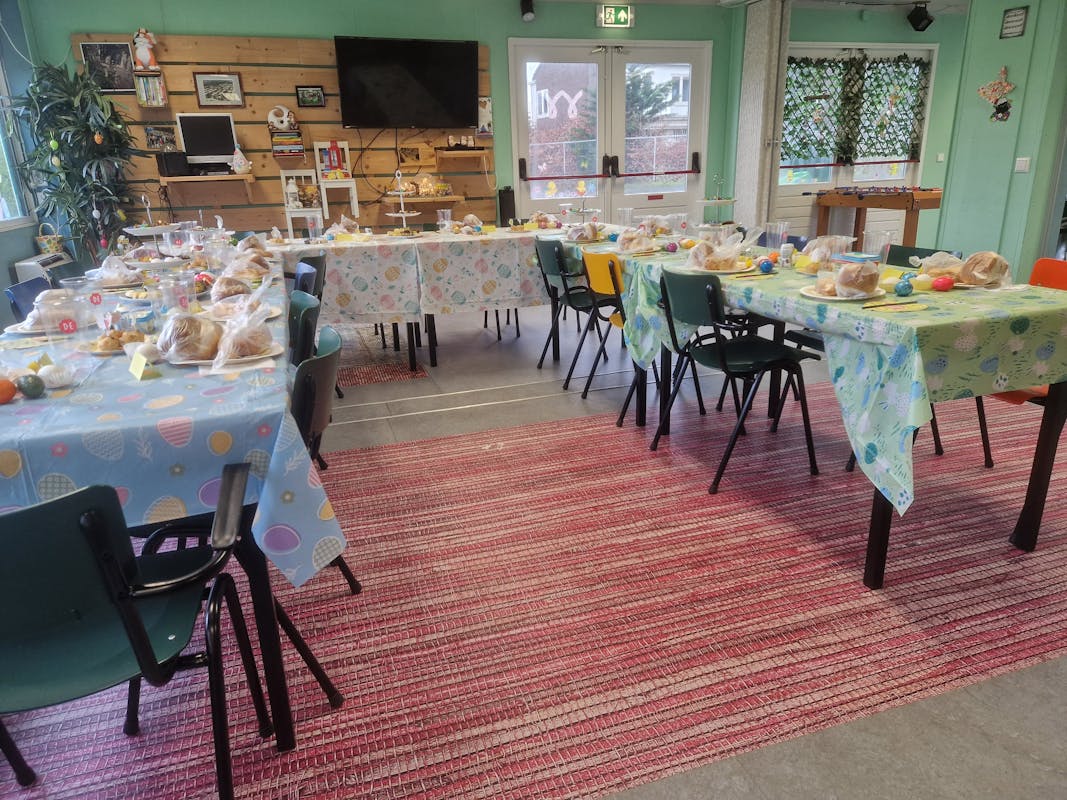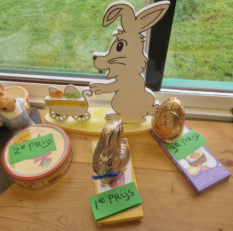 Vandaag een heerlijke, gezellige Paasbrunch met 22 personen. Er was voor iedereen genoeg allereerst de gezellige paas aankleding op de tafel ... iedereen had op zijn/haar bord een wit+ bruin broodje, melkwit+chocolade broodjes, 2x gekookt ei, 1 chocolade ei. Er was koffie, thee, melk, jus orange, perensap, appelsap, cocacola, cola zero. Er lag ook wit en bruin brood, matzes, mini muffins, druiven, vruchtjes en na afloop advocaat, wijntje ... en dan de etagere met lekkers.