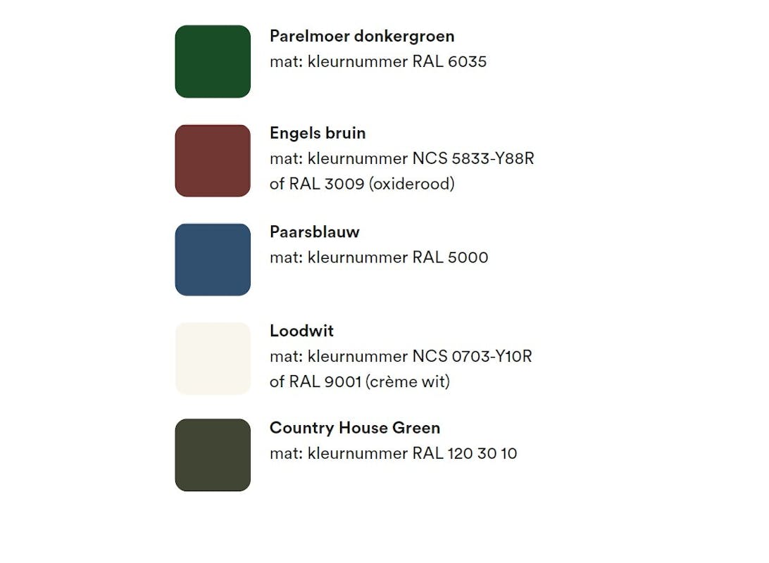 Voor het onderhoud van je voordeur, hekje of kozijnen is het handig te weten wat de juiste kleurnummers zijn. Met het kleurnummer kun jij of jouw schilder de juiste verf bestellen. Je vindt deze informatie in het Wielewaal kleurenschema 2025.pdf of in het kleurenschema dat onderdeel was van de verkoopdocumentatie.
