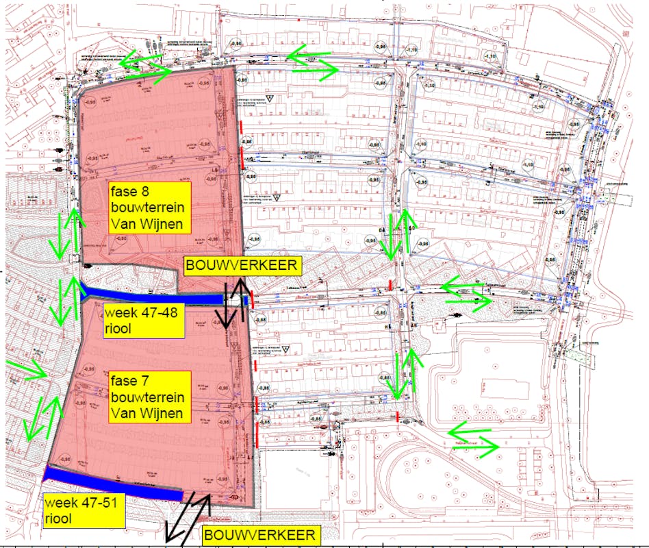 In het deel van de Warmoldstraat tussen de Minkestraat en de sporthal wordt nieuwe riolering aangebracht. Hierdoor kan het bouwverkeer vanaf de Wichardstraat niet meer linksaf de Warmoldstraat opdraaien. Het bouwverkeer voor alle fases rijdt nu via de bouwweg die naast de voormalige Marjoleinstraat ligt. Met de zwarte pijlen is dit op de tekening aangegeven.