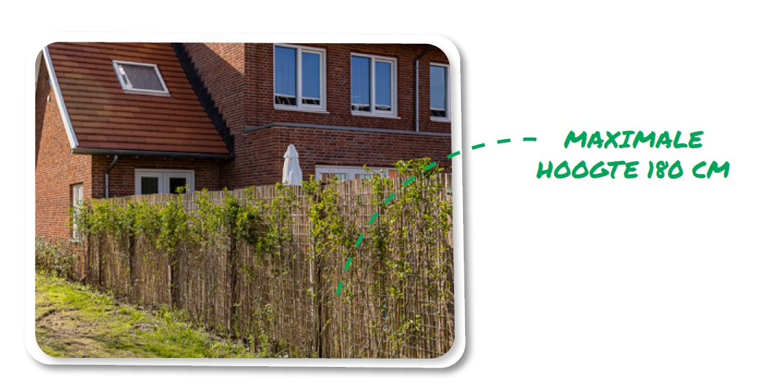 De architect adviseert maximaal 180 cm voor de hoogte van het hek of de haag. De hoge erfafscheidingen tussen de woningen mogen niet voorbij de voorgevel uitsteken. Dit om het vriendelijke straatbeeld in stand te houden.