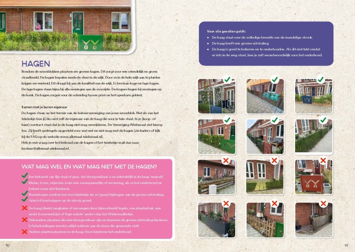 De hagen staan op het terrein van de beheervereniging van jouw woonblok. Net als van het tuinhekje ben jij dus niet zelf de eigenaar van de haag die voor je tuin staat. In je (koop- of huur) contract staat dat je de haag niet mag verwijderen. De Vereniging Wielewaal ziet hierop toe. Zij heeft spelregels opgesteld voor wat wel en niet mag met de hagen.