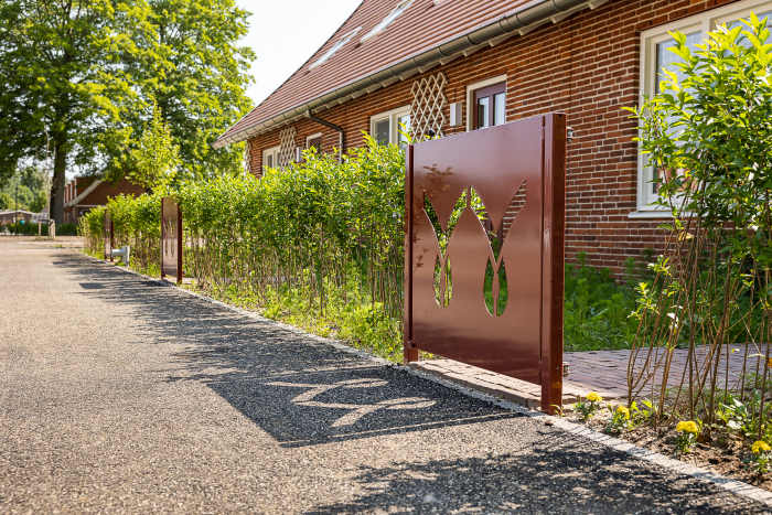 De tuinhekjes in de voortuinen zijn speciaal ontworpen voor de Wielewaal. Je hebt het logo vast herkend. Het versterkt het Wielewaalgevoel; een vriendelijk buurtje waar je makkelijk even bij elkaar aanklopt of binnenloopt. De hekjes vormen samen met de haag de erfafscheiding.